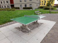 Die Tischtennisplatte steht in mitten der Grünanlage zur freien Verfügung.
